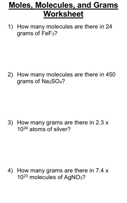 Moles Molecules and Grams Worksheet 1 How many molecules are there in 24 grams of FeF3. 45 grams 1000 milligrams 4500 milligrams. If you want to find the number of atoms in the sample you can then take the calculated number of molecules and multiply it by the number of.