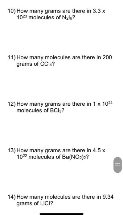811 X 1022 formula units of sodium chloride _____ moles. 10 How many grams are there in 33 x 1023 molecules of N2I6. How many molecules are there in 200 grams of CCl4.